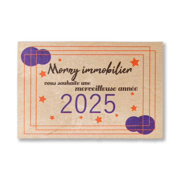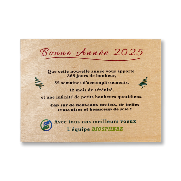 Offrir ses voeux sur bois, c’est marquer les esprits autrement. Chaleureuse, naturelle et singulière, la carte de voeux en bois se distingue par son caractère unique et sa capacité à traverser le temps. Contrairement aux supports classiques, elle ne se jette pas : elle se garde, s’expose, se partage.