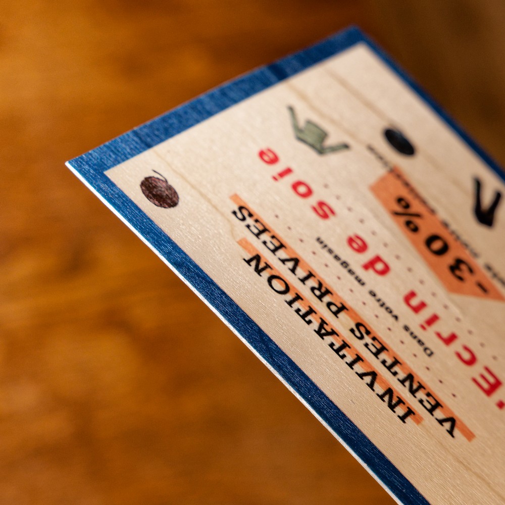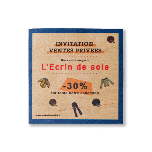 Nos cartes promotionnelles en bois transforment une remise temporaire en un souvenir durable. Contrairement aux flyers jetables, elles interpellent, étonnent, se conservent — et prolongent votre visibilité au-delà de l’instant.